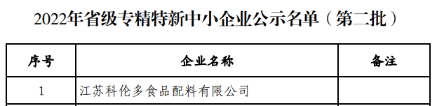 ? 近日,連云港市工業(yè)和信息化局公布了江蘇省2022年專(zhuān)精特新中小企業(yè)名單,江蘇科倫多食品配料有限公司榜上有名。